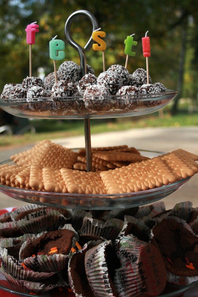I helgen firade vi vår son som fyllde två år i veckan. Kalas för små barn innebär oftast att en eller flera föräldrar följer med och så även syskon. Då är man ganska snabbt uppe i ett stort antal gäster och hur man än gör, kvävs det plats. Jag hade tänkt till om allt jag ville baka och slog till på en chansning om att vara i sonens favoritpark. Kvällarna innan bakade jag tills frysen var full och varje dag regnade det.. Men då vi vaknade upp på lördagen hade det regnat färdigt och höstluften kändes klar. Vi packade dubbelvagnen full med stora fat, juice, kaffe, mjölk och alla bullar och kakor och tog oss fram till parken där vi hittade ett lite lagom avskilt hörn som vi sett ut tidigare. Det är så charmigt med höstklädda barn tycker jag. Fleece, kängor, västar, sköna mössor (inte sådana som blir ett måste på vintern) och små vantar. Plötsligt strömmade en mängd sådana små vänner till hörnet, dit även solen tagit sig. Då bull- och kakbuffén väl var på plats, var friheten i naturen värd allt! När man är ute blir ljudnivån inte lika hög som inne, barnens fantasi och upptäckargjädje går igång och frisk luft mår ju de flesta bra av. Det var inga problem att komma och gå som man ville och alla åt och var nöjda med att kunna varva fika och lek efter behov. Nu är jag väldigt förtjust i hösten och vi hade tur med vädret denna dag.. men jag kan även längta till då jag ska få fixa långbord en varm sommardag eller ett pulkaparty med snöänglar och varm choklad..