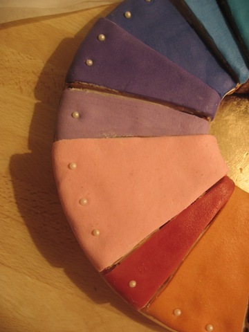 Dekorera kakan med chokladsmörkräm och skär sedan ut trekanter från färgad o kavlad marsipan att dekorera med.